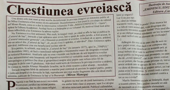 Rescrierea istoriei continuă însă, în România, pe toate căile posibile: eliminarea sau estomparea, în curricula școlară, a istoriei românilor și înlocuirea ei cu istoria evreilor, rapoartele de monitorizare ale Institutului Wiesel, legile „mucles” privind abordarea chestiunii evreiești altfel decât „kosher” etc.